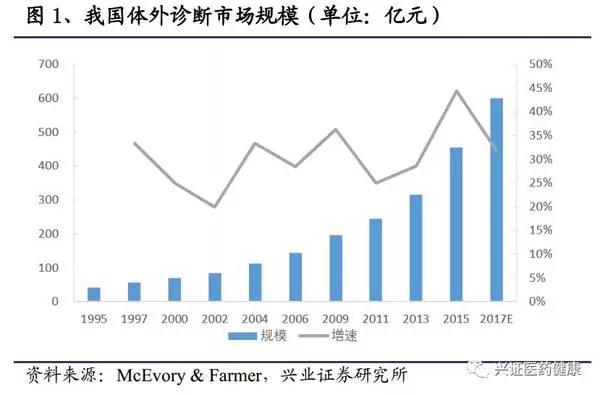 我國體外診斷行業(yè)相較于歐美市場,起步較晚,但發(fā)展快速,2015年,我國IVD市場規(guī)模達450億,預計2017年市場容量有望擴增至600億