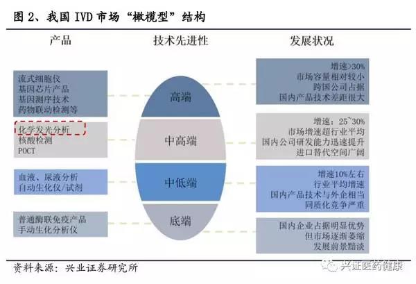 產品結構上,我國體外診斷行業(yè)總體呈現“橄欖型”結構:低端市場是前期廣泛使用的檢驗技術,發(fā)展空間小,增速緩慢,正在進行方法學上的更新和迭代;中端市場由于近幾年國產研發(fā)能力迅速提升,渠道優(yōu)勢明顯,國內產品正在處在高速發(fā)展階段;高端市場由于技術壁壘高,國內外差異大,主要為國外產品,國內產品目前在研發(fā)潛伏期,未來將迎來增長。