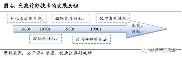 免疫診斷的發(fā)展需要依靠免疫學技術的不斷革新,免疫診斷的變革依次經歷了放射免疫檢驗(RIA)、膠體金快速檢驗、酶聯免疫檢驗(ELISA)、時間分辨熒光免疫(TRFIA)的迭代,最終迎來了化學發(fā)光免疫檢驗(CLIA)的時代。