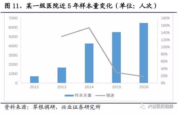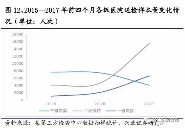 以某第三方檢驗中心為例,其發(fā)光樣本主要來自一、二級未開展發(fā)光檢驗的醫(yī)院和三級醫(yī)院本身檢驗科超承載量的部分。根據銷售數據,在送檢的三個級別醫(yī)院中各抽12家穩(wěn)定送檢醫(yī)院可見,總體樣本量呈增長趨勢,其中,一二級醫(yī)院檢驗樣本數量快速增長,在2017年三級醫(yī)院樣本量有所下降,其可能原因,一是醫(yī)院新購發(fā)光儀器可承載更多的樣本檢測,二是由于分級診療的效果顯現,三級醫(yī)院的樣本檢驗量下調。