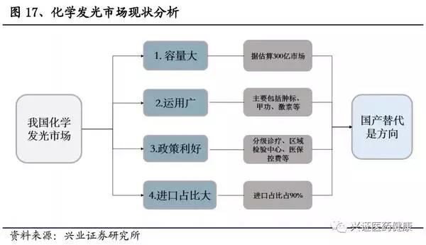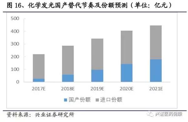 目前,化學發(fā)光行業(yè)以25%-30%的增速增長,現國內企業(yè)已突破技術壁壘,進入銷售放量階段,參考生化替代的節(jié)奏,5年內可占有近一半的市場份額。預計在2021年,國內廠家可總共占有百億以上的市場份額。