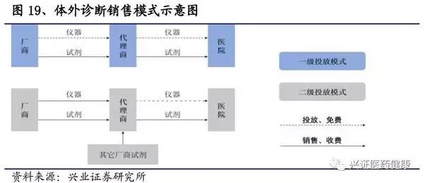 醫(yī)院是產業(yè)鏈上最強勢的一環(huán),國產產品對醫(yī)院的吸引力決定著國產替代進程。在銷售模式上,公司多采用直銷和經銷相結合,以經銷為主。對于醫(yī)院終端,儀器基本以投放獲得,廠商以搭配銷售試劑的方式獲得收益。體外檢測等醫(yī)療服務由政府統一定價,應用化學發(fā)光法可相應提高收費標準(例如:福建省用化學發(fā)光法可加價80%)。因此,試劑屬于醫(yī)院的“成本項”,醫(yī)院有動力對檢測方法進行升級迭代,但卻并沒有動力去特意抬高價格,在相同條件下會考慮試劑性價比,相對市場化。