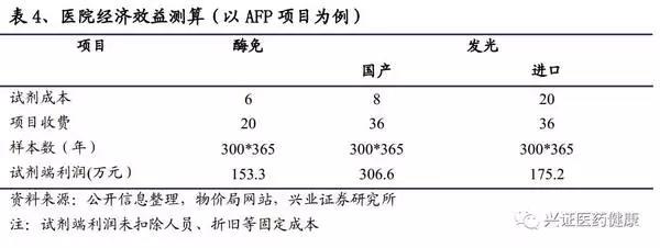 由于儀器是通過投放的形式進駐醫(yī)院,從醫(yī)院端只需要計算試劑成本。以上測算可得出,此醫(yī)院若用發(fā)光替代酶免不僅進行了檢驗技術升級,得到優(yōu)化的檢驗結果,在經濟效益上也更優(yōu)。在發(fā)光項目上,國產對比進口經濟效益明顯,單個項目可得到百來萬的額外收益。