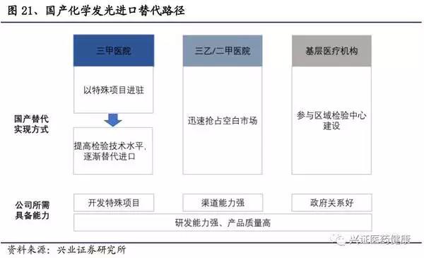 對于三甲醫(yī)院,其技術偏好較高,從目前的市場反應來看,國產發(fā)光儀器和試劑的精確性和穩(wěn)定程度仍不能達到三甲醫(yī)院的要求。同時三甲醫(yī)院多有聲譽追求,對進口品牌的忠誠度高。在價格上,樣本量大、檢驗結果質量要求高、檢驗人員成本高致使其相對價格不敏感。而國內廠家對于試劑的研發(fā)仍停留在檢測項目的拓展上,基于現狀,大規(guī)模進口替代較難實現。有些特殊項目未涉及,如藥物濃度檢測等,可作為突破口進駐高端醫(yī)院,建立品牌形象。總體來說,短期內國內廠商可依靠特殊項目檢查可獲得三級醫(yī)院小部分份額,長期來看,想進駐高端醫(yī)院并獲得主力項目的份額,須加大研發(fā)投入,做好做精發(fā)光試劑,打破醫(yī)院對于國產山寨的慣性認知。
