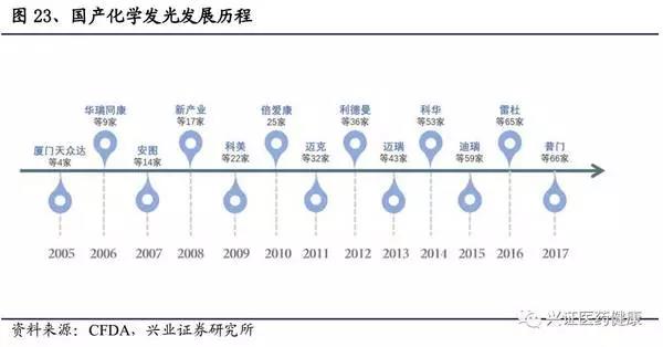 我國化學發(fā)光市場被進口企業(yè)壟斷已久,長期以來內資企業(yè)以代理國外產品獲得收益。在代理的過程中,內資企業(yè)慢慢積攢經驗,逐步開始自主研發(fā)的道路。經歷10多年的發(fā)展,現獲得發(fā)光批文的廠家有數十家,新產業(yè)于2010年推出第一臺全自動化學發(fā)光分析儀,國產機器正式進入化學發(fā)光領域,2017年普門電化學發(fā)光儀剛剛獲批,預期未來會大有作為。近幾年,技術壁壘被逐步突破,國產化學發(fā)光進入鋪開放量期。