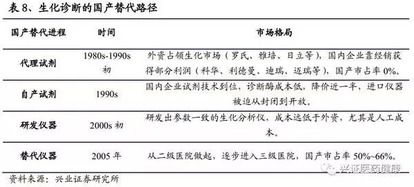 現今,化學發(fā)光的發(fā)展階段與2000年左右的生化市場相似,回顧生化市場的國產替代進程,可有一定的啟示作用。生化的發(fā)展首先從代理國外廠家的試劑開始,逐步自主研發(fā)試劑,此時促使國外廠家對其生化系統進行開放。而后逐步研發(fā)出生化儀器,對整個生化診斷進行替代。進程如下: