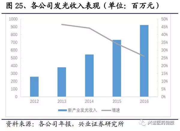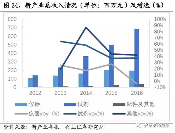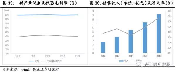 新產業(yè)2016年總收入9.23億元,絕大部分為發(fā)光產品,2012-2016年,新產業(yè)收入復合增速保持在37%左右。其中試劑增速較高,保持在35%以上,隨著儀器投放的增加,試劑的增速將會上升。由于近幾年空白市場將逐漸被消化,儀器的增速將呈現下降的態(tài)勢。