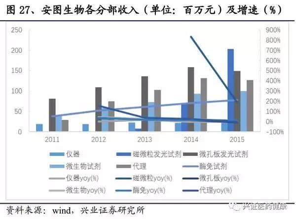 安圖生物業(yè)績成長迅速,2012年至2016年增速均保持25%以上,營收CAGR為32.5%。2016年實現營業(yè)總收入9.8億元,同比增長36.87%。其中,磁微粒發(fā)光試劑從2013年起產生收入,2015年收入達2億元,增速大于100%。