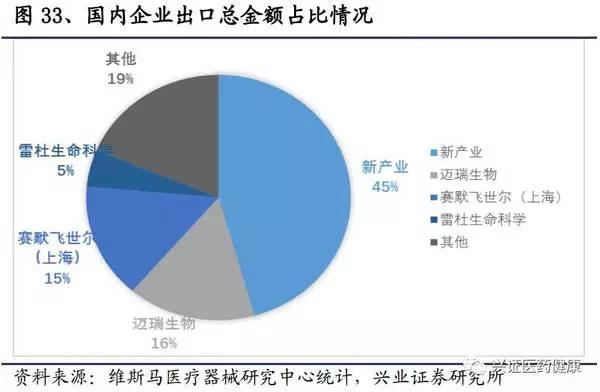 渠道能力強,國內外銷售情況表現不俗。新產業(yè)采用經銷為主,直銷為輔的模式進行銷售。在國內市場,新產業(yè)終端用戶分布范圍廣,省份分散,覆蓋醫(yī)院3000多家。其中,二級醫(yī)院有1千多家,三級醫(yī)院近1千家,一級醫(yī)院較少。今后,一級醫(yī)院市場將被充分開發(fā),將通過自購或者區(qū)域檢驗中心的方式,將免疫檢測技術更新至化學發(fā)光法,市場空間巨大。在出口方面,儀器出口收入占到總收入近一半,試劑出口收入占到10%左右。2016年出口總額為國內第一,占到總金額的45.6%。