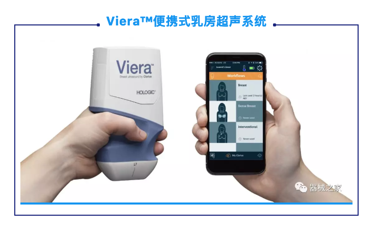 POCUS進(jìn)入乳房成像的另一個(gè)例子是2018年Hologic新推出的Viera?便攜式乳房超聲系統(tǒng)。無線超聲掃描儀為醫(yī)生提供了早期診斷和優(yōu)化臨床工作流程的機(jī)會(huì)。它可以指導(dǎo)介入程序,如活組織檢查,標(biāo)記放置和電線本地化。它還可以將乳房圖像傳輸?shù)街悄茉O(shè)備或PACS。